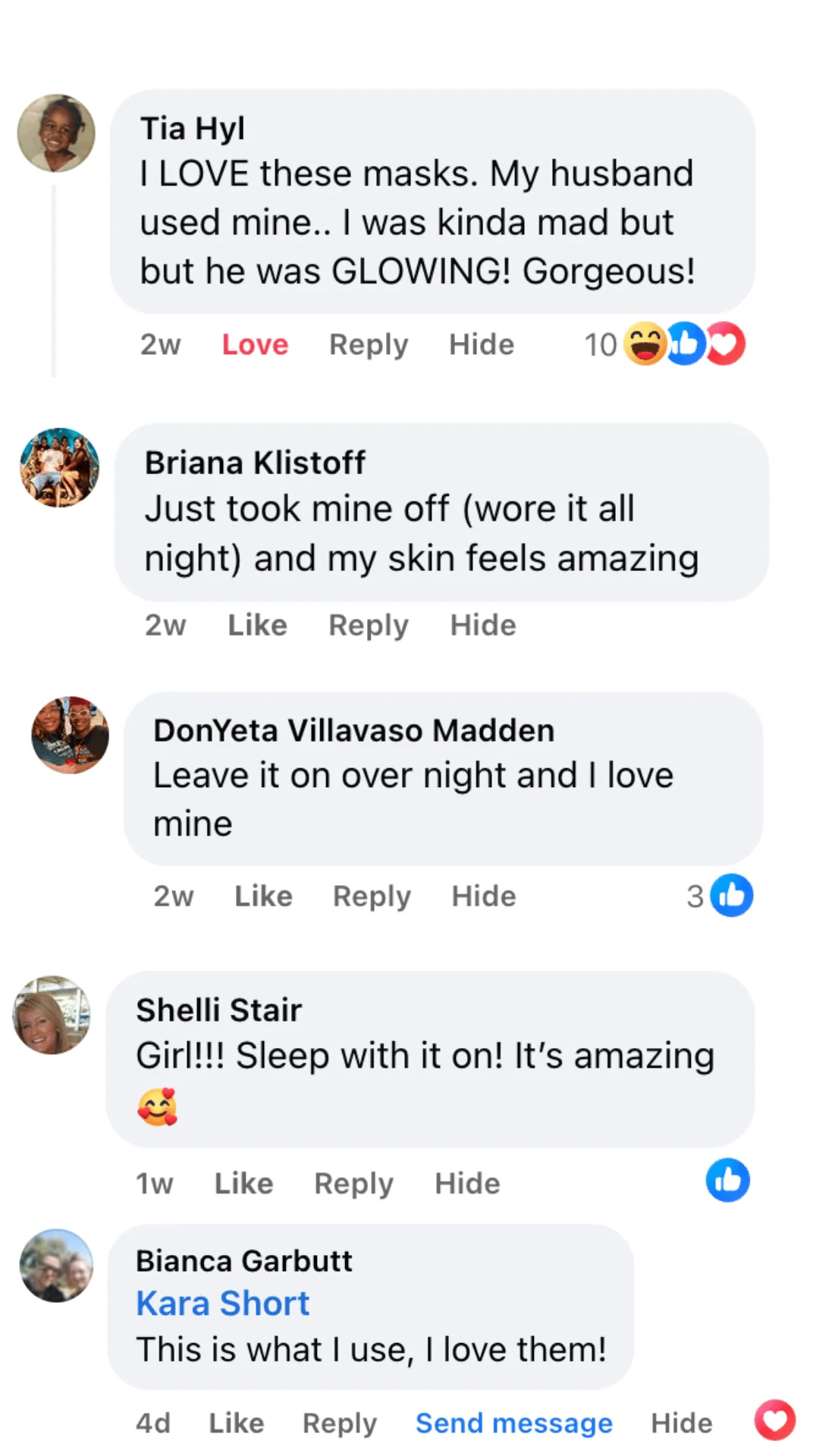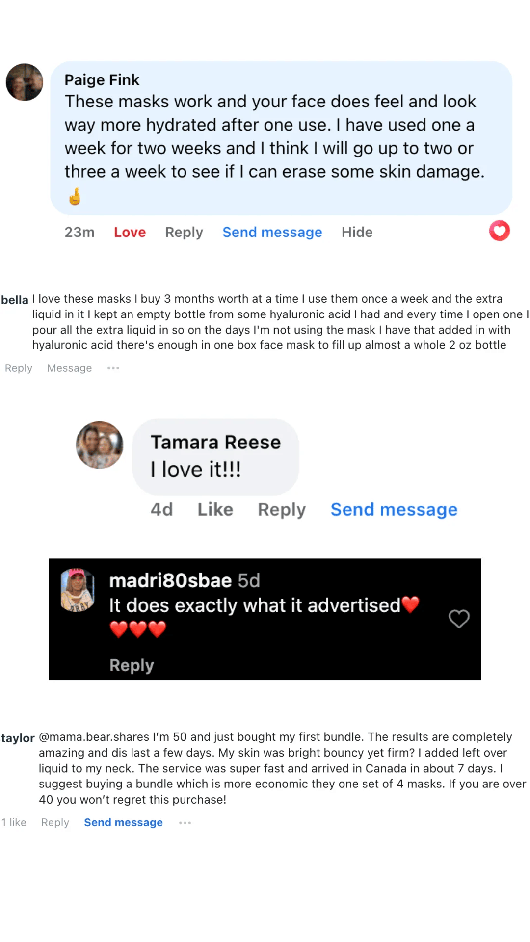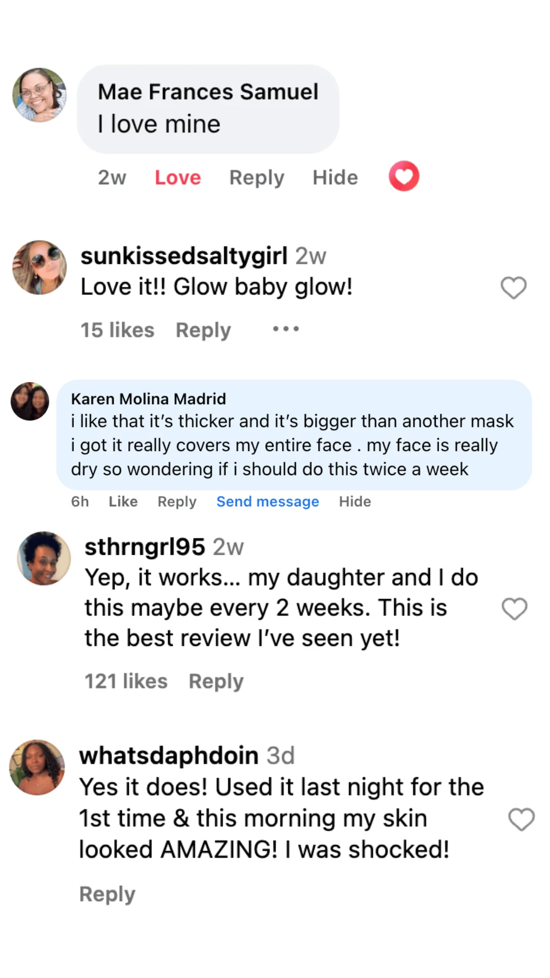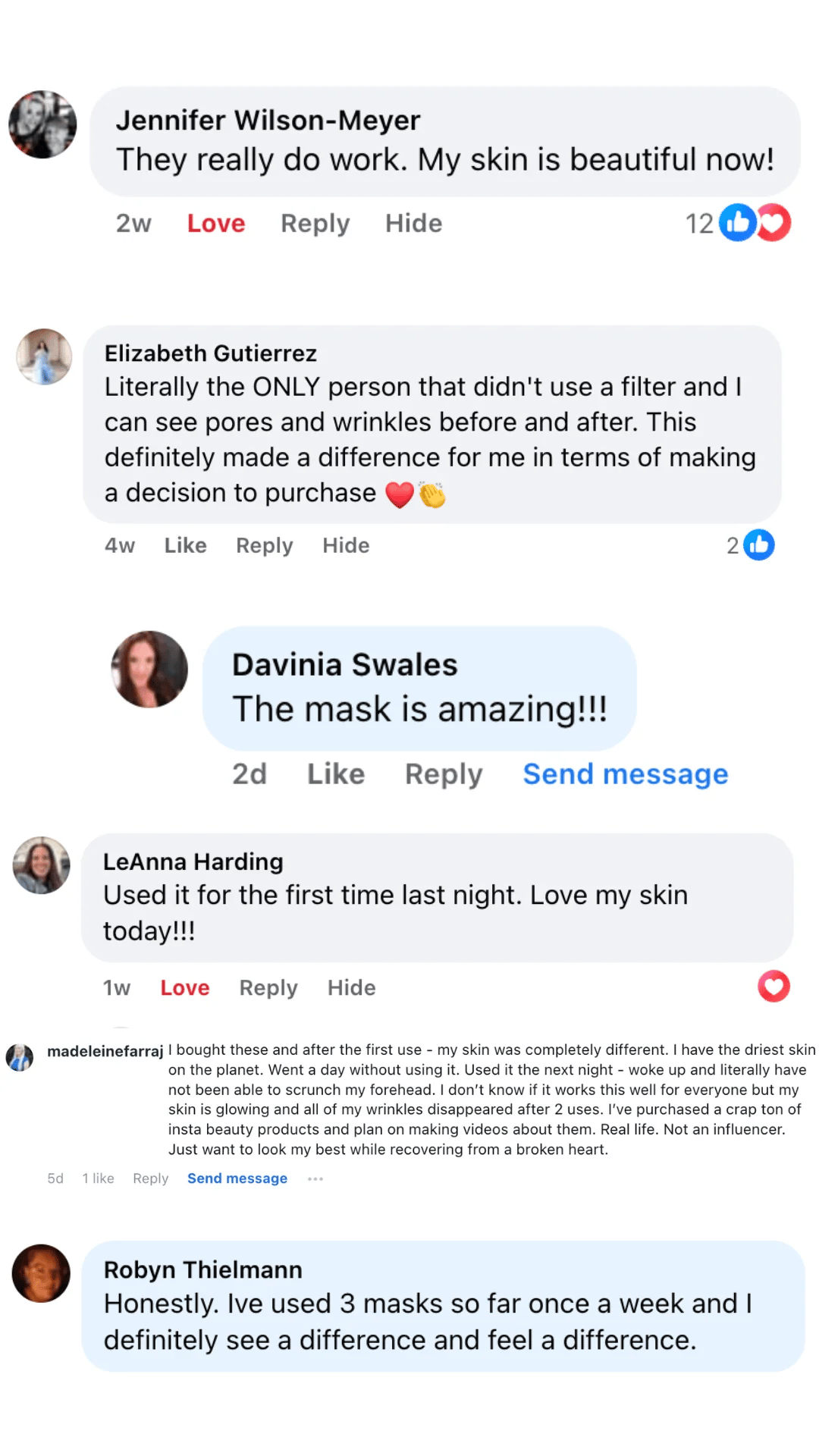 | Lasting Results. 1 mask = 7 days of visible glow | ||