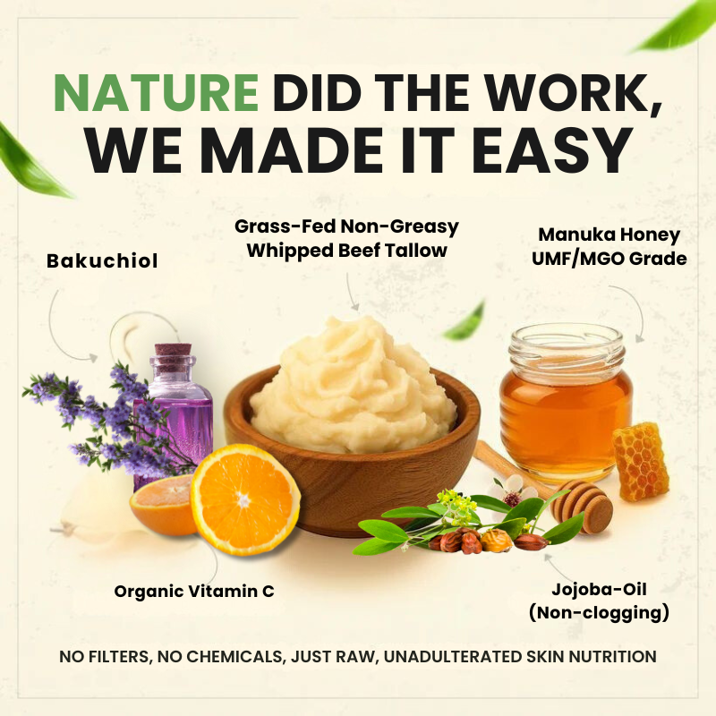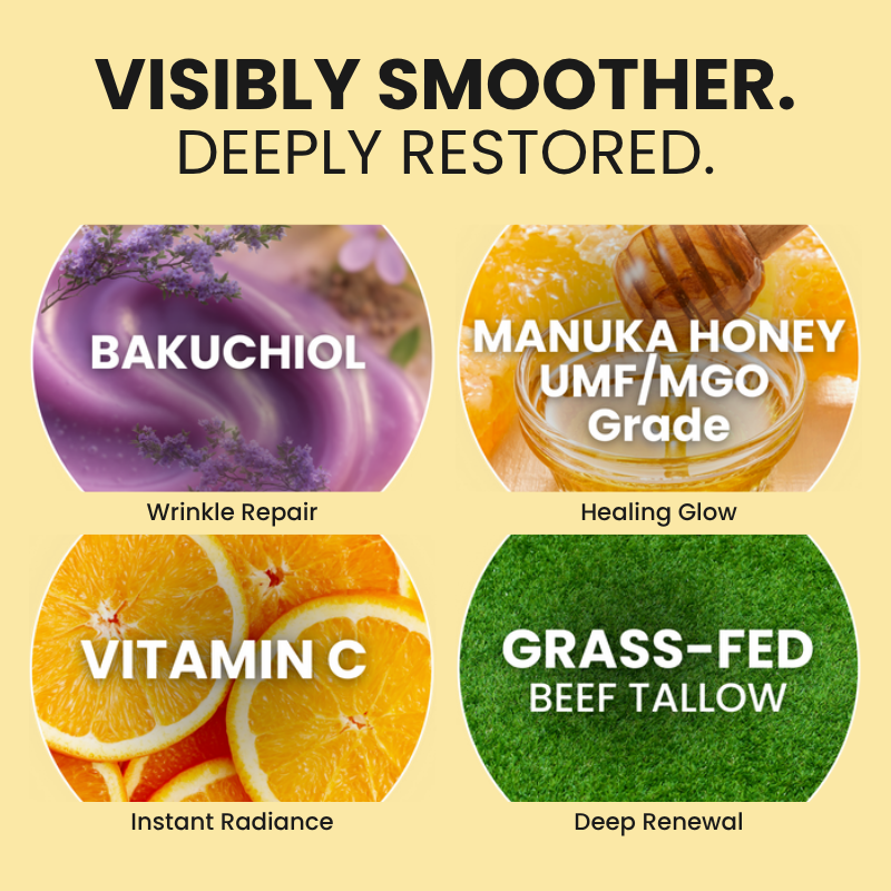 Other tallow balms? Just basics: tallow + honey. Comforting, but not transformative. Silque adds wrinkle-fighting science—bakuchiol and THD Vitamin C—so you get both ancestral wisdom and modern anti-aging results.